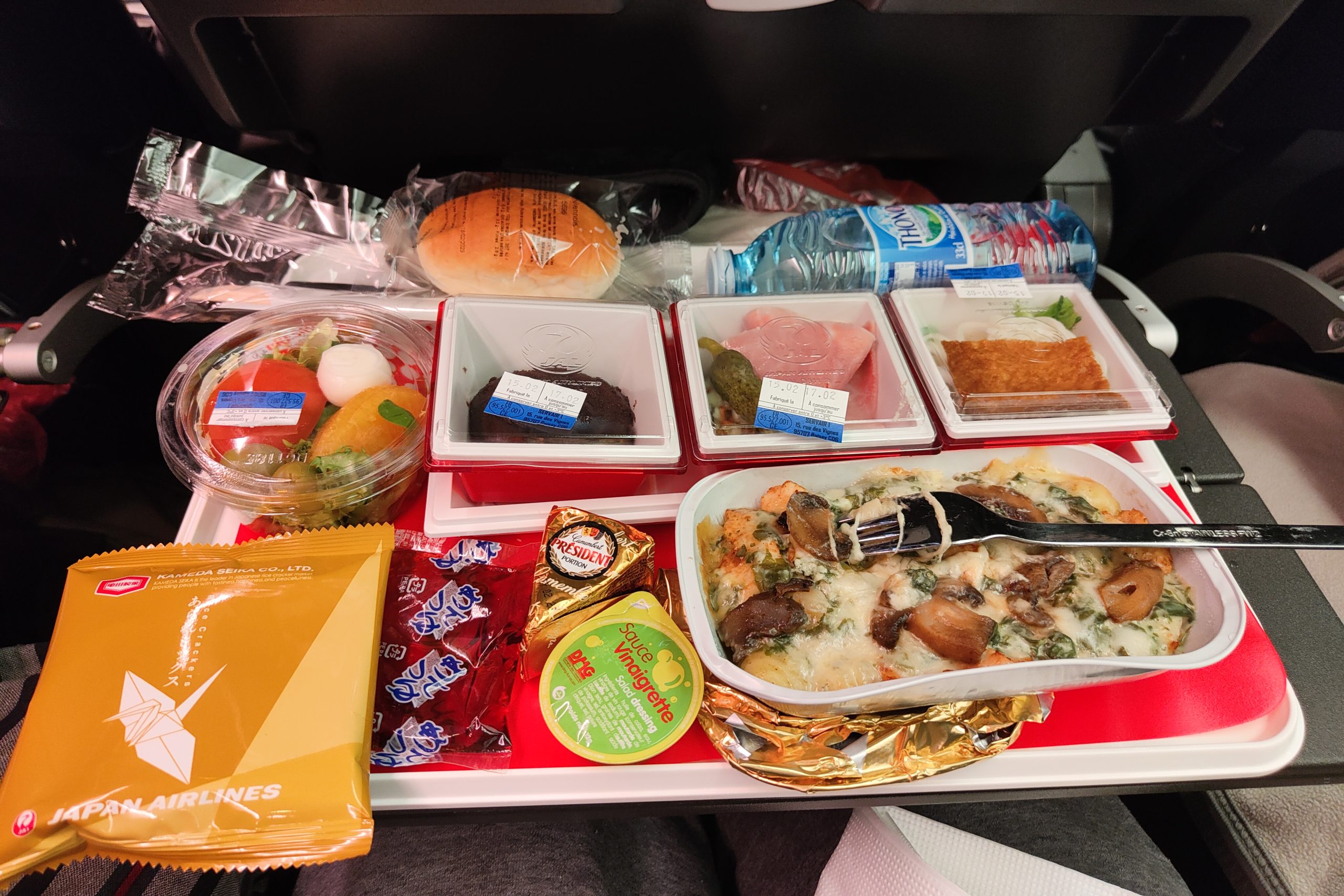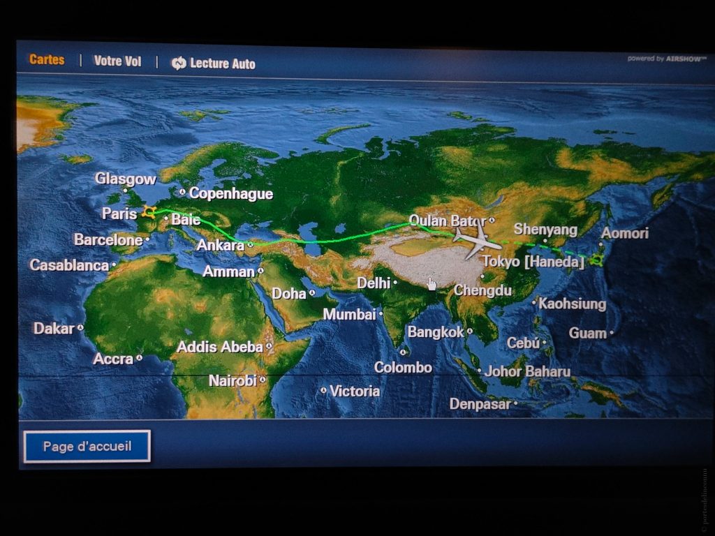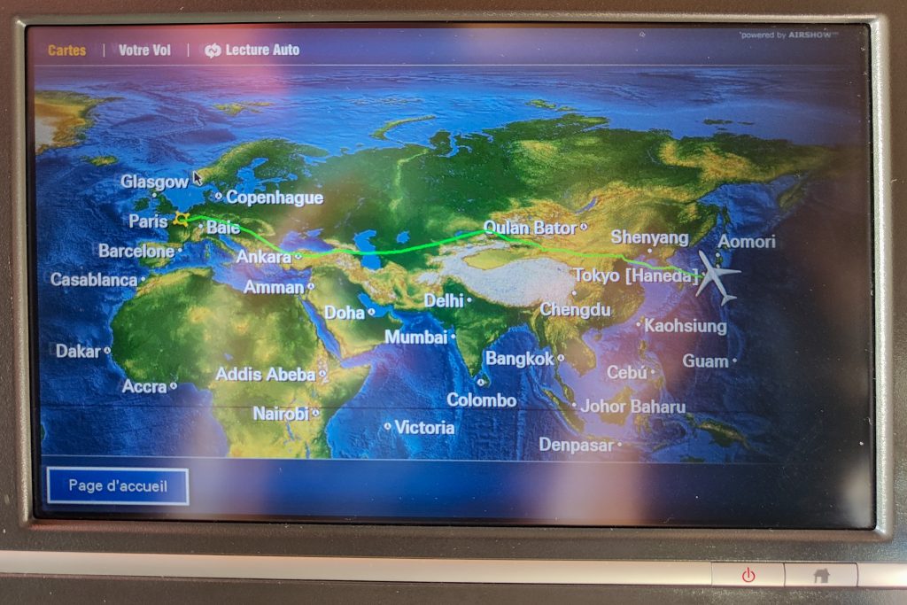 Quasiment synchro avec une amie à nous se trouvant dans le terminal d’à côté, nous partons. Nous survolons d’abord la région Parisienne de nuit, et nous voyons la Tour Eiffel d’en haut en partant. Très vite, les villes ne sont plus que des petits points lumineux très lointains. Malgré le voyage en classe économique, il y a assez de place pour les jambes, même pour quelqu’un de grand comme Leelee. Nous voyageons avec Japan Airlines en vol direct, qui est une très bonne compagnie aérienne. Et qui dit bonne compagnie aérienne, dit bon repas !