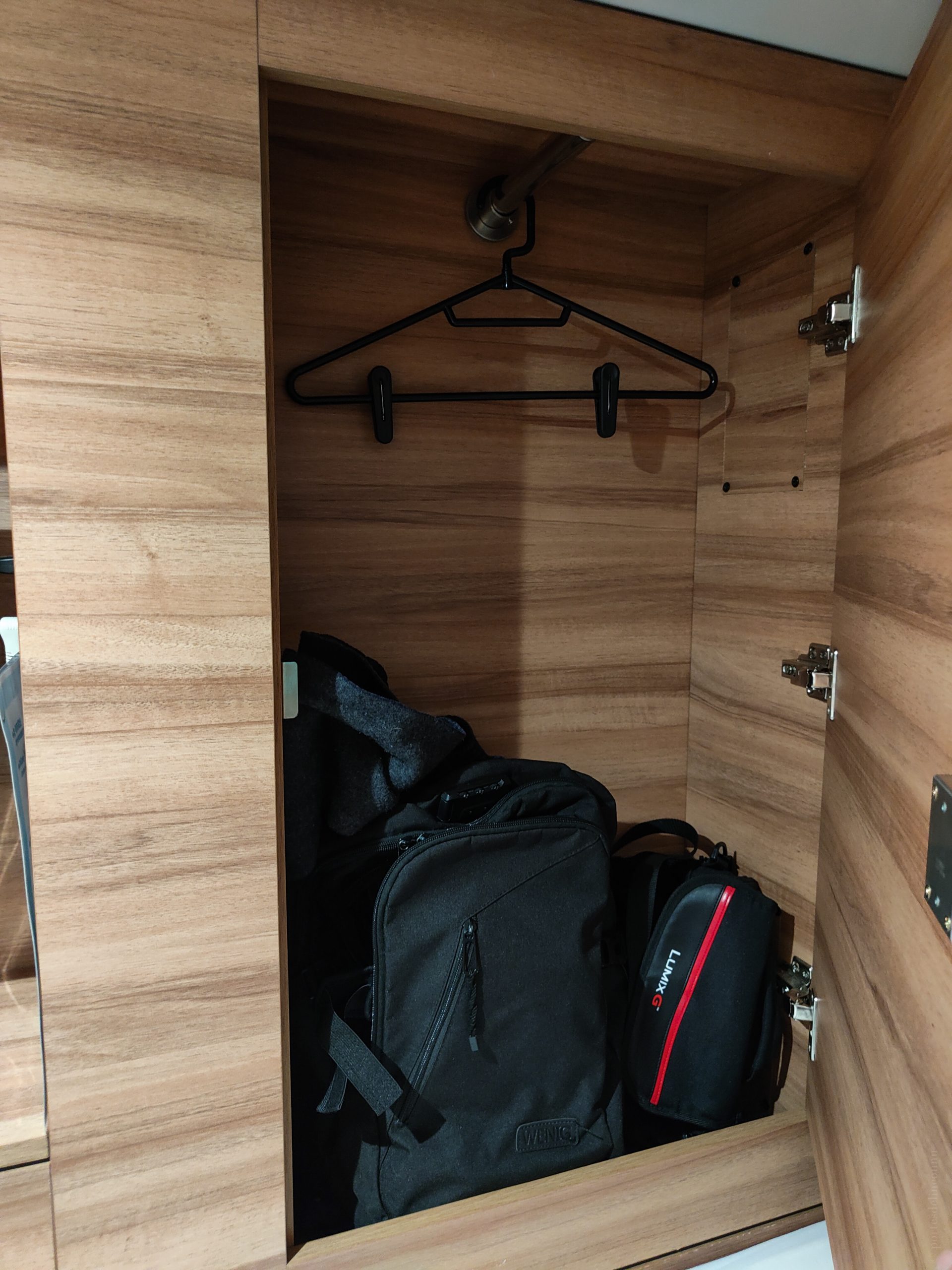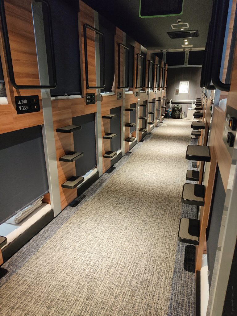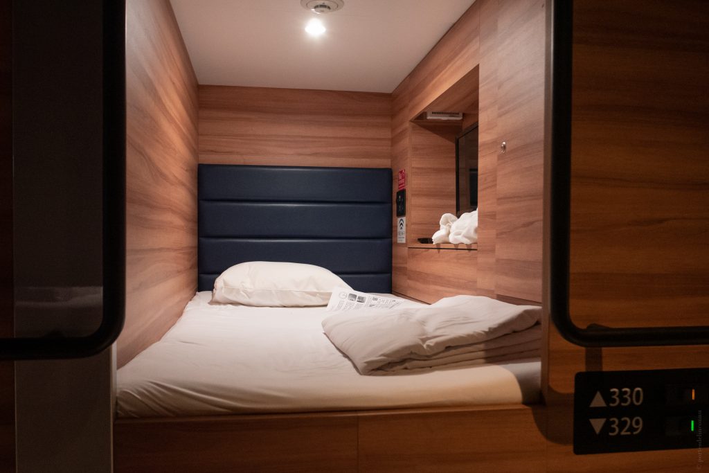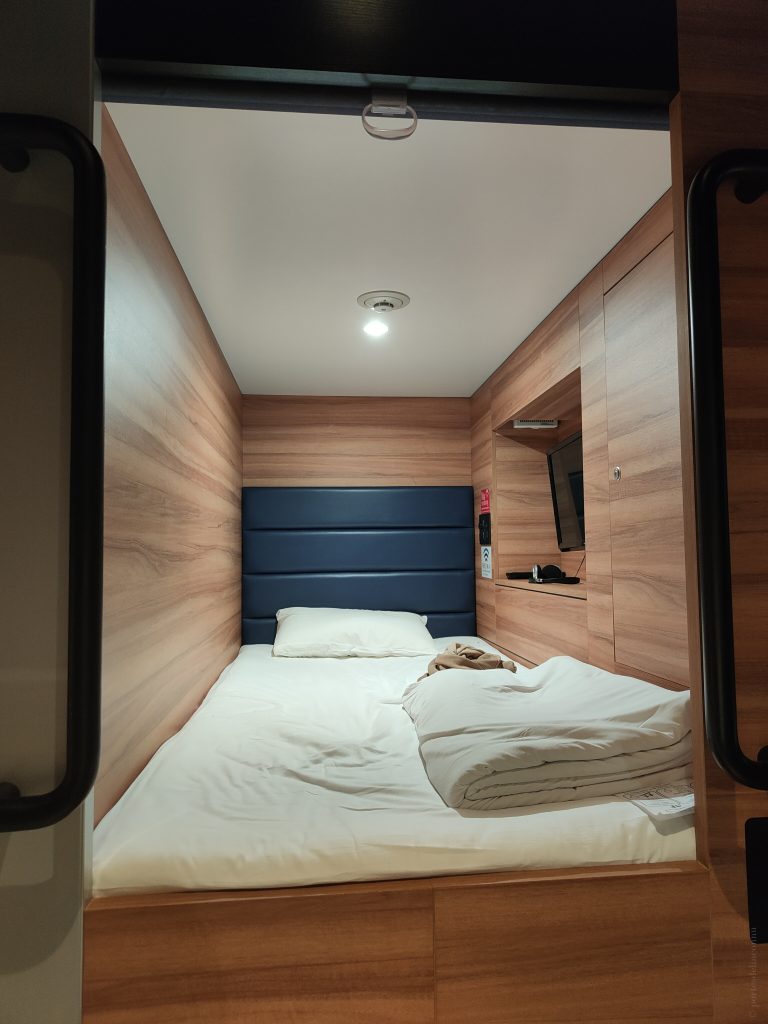 Il s’agit donc, au fond, effectivement juste d’une « boite à sardines » qui contient un lit, avec un rideau devant. Il me semble que certains hôtels capsules ont des portes à la place des rideaux, peut-être sur une gamme plus élevée. Cependant, cette petite boite à sardines est plutôt bien équipée ! Il y a des prises, des prises USB, des lampes, et même une télé ! Je ne m’en suis pas aperçu de suite, mais il y a même une petite armoire refermable à clef dans laquelle on peut mettre notre manteau et d’autres affaires personnelles. Bien qu’il soit pas assez gros pour la valise qui doit rester dans l’espace commun, ça suffit bien pour mettre son sac à dos et des habits. La capsule est assez haute pour s’asseoir et assez grande pour s’allonger sans se sentir claustrophobe, même pour de grandes personnes. Le lit était même plutôt confortable, honnêtement.