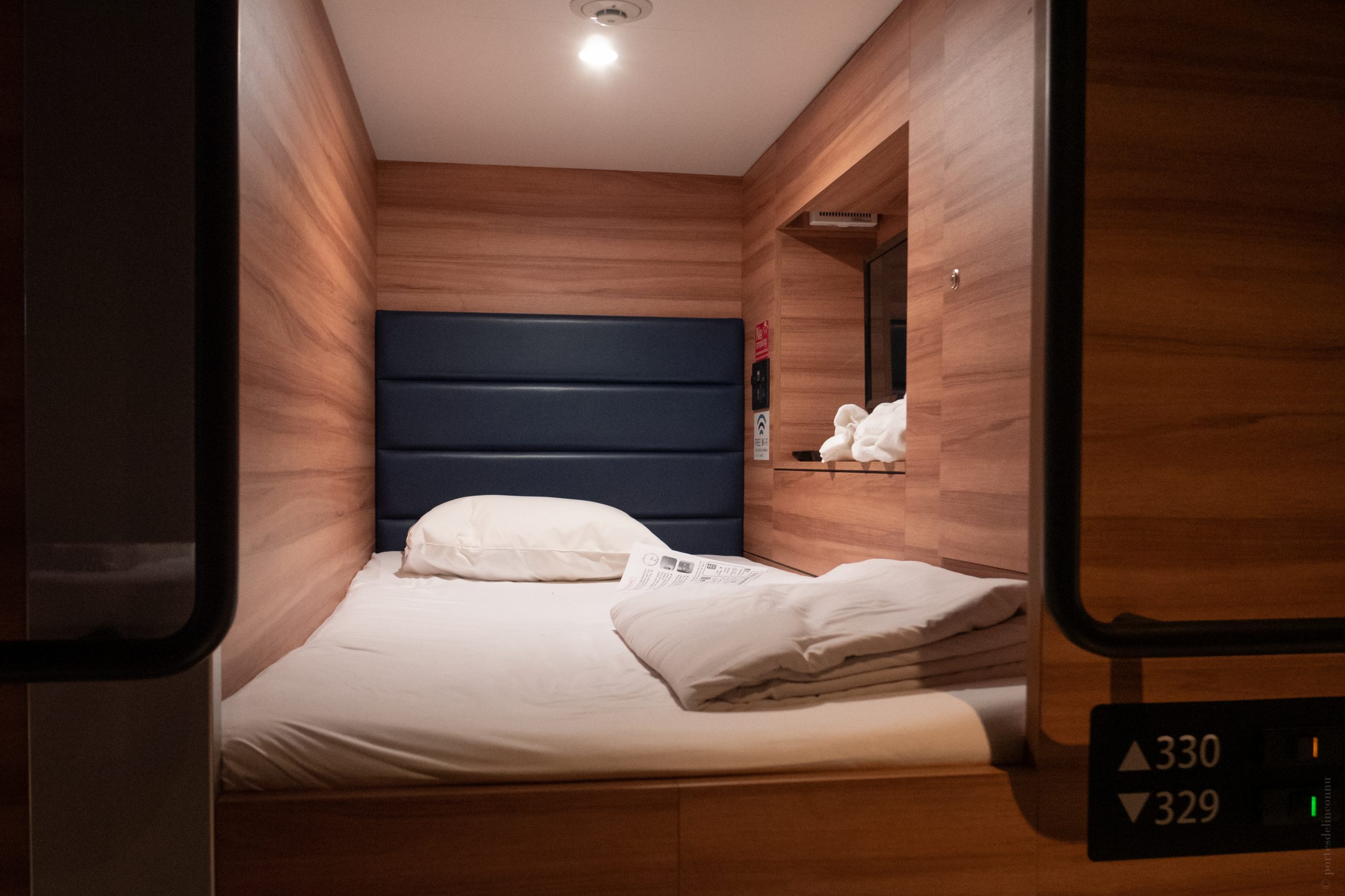 Nous sortons de la gare, longeons le parc d’Ueno, et trouvons notre hôtel après quelques minutes. Nous montons aux étages déposer nos bagages, et j’y découvre ma capsule pour la nuit d’un coup d’œil rapide.