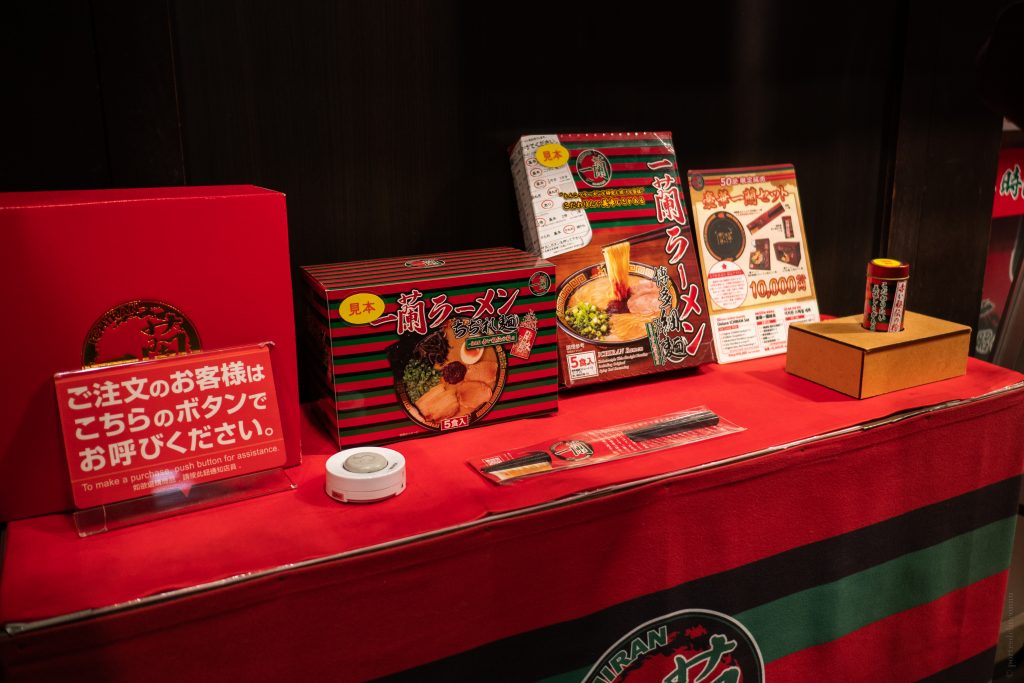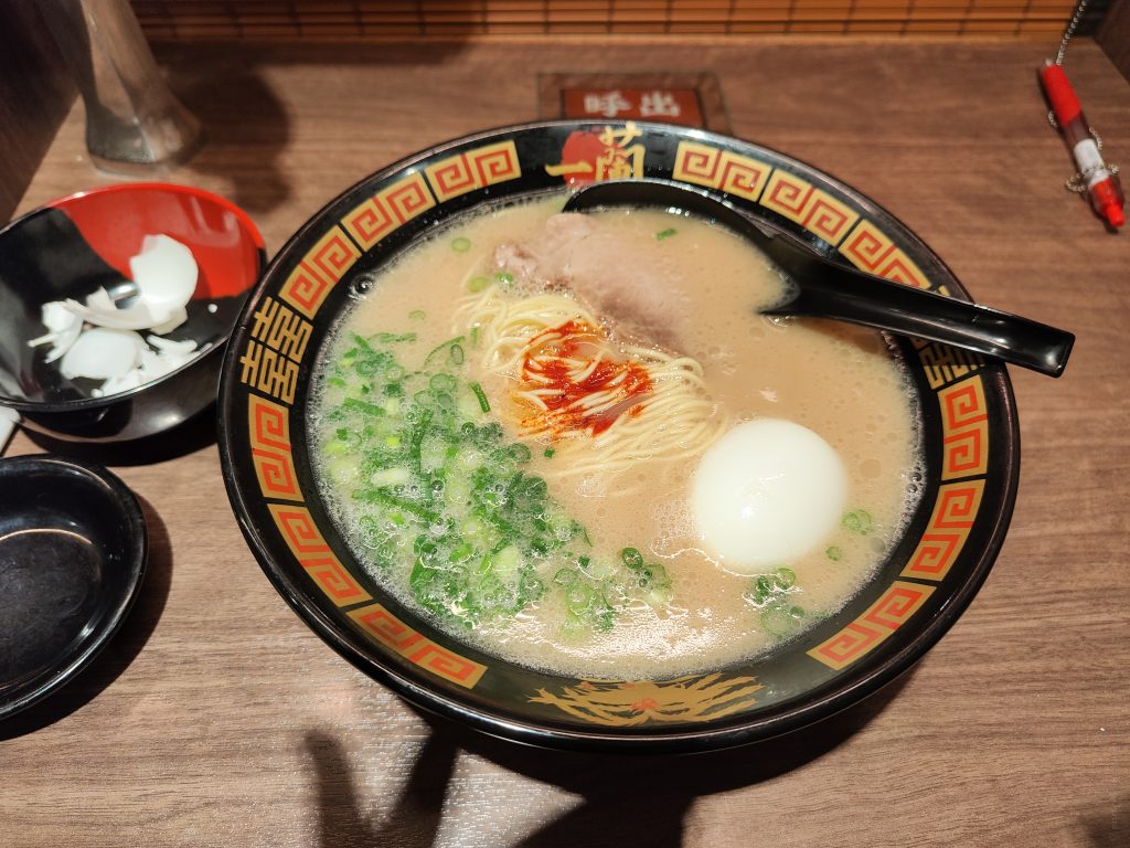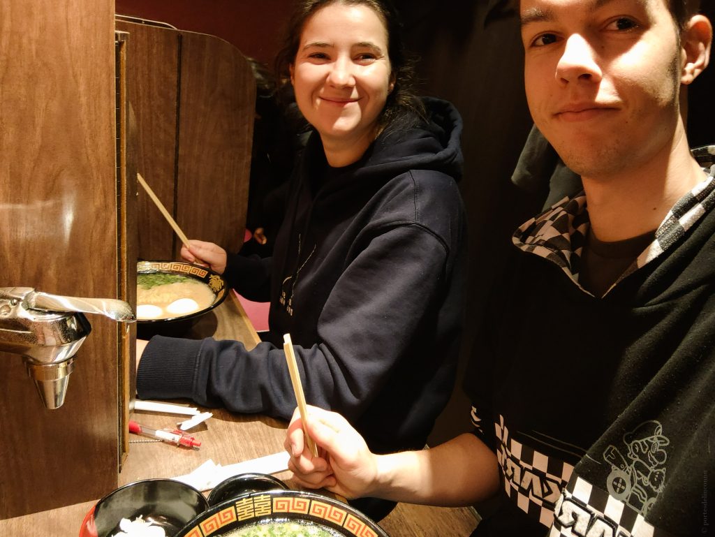 Nous partons donc en quête de nourriture. Leelee savait déjà exactement ce qu’elle voulait manger (depuis des mois), et où. Bien évidemment, c’était l’heure du ramen. Non loin de là se trouvait un restaurant nommé Ichiran Ramen, qui est une chaine populaire là bas. On s’y dirige, et malgré un petit peu de queue, l’attente ne fût pas très longue. On commande notre ramen sur une machine qui nous sort une petite étiquette, et on va s’asseoir le long du comptoir où se trouvent des petits enclos individuels, qu’on peut élargir si on y mange à plusieurs. On passe simplement les étiquettes de commande, et le repas arrive très vite. Vient ensuite la régalade ! Itadakimasu !
